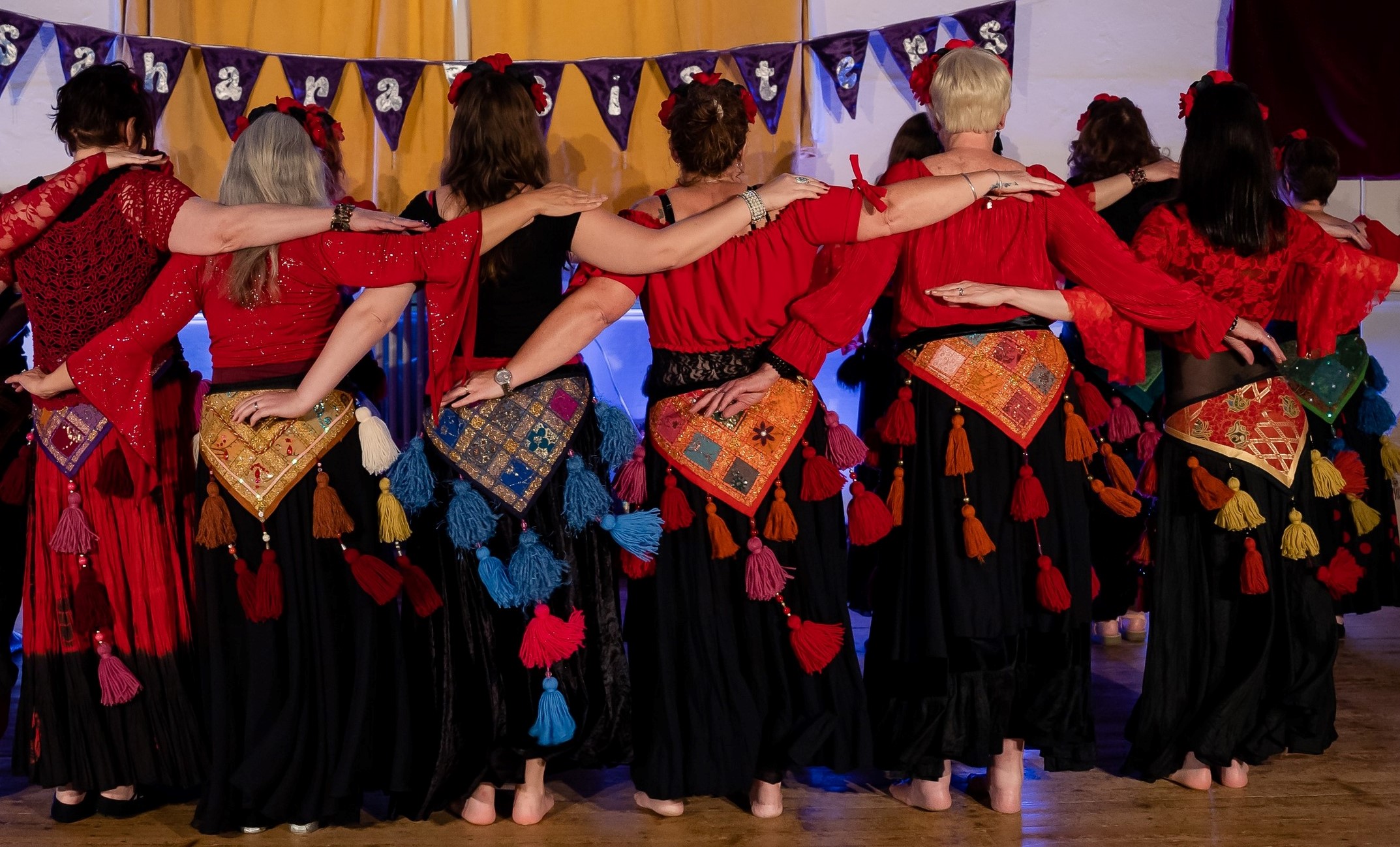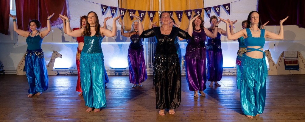 As well as our weekly classes, the Sahara Sisters also put on an annual show (a Hafla, to give it its proper Arabic name) each autumn. This gives us the opportunity to showcase what we’ve been working on in class, and is a wonderful chance to get dressed up in some amazing performance outfits (the more glitter, sequins and sparkles, the better!). We are regularly invited to perform at other local groups’ Haflas, as well as at community and fundraising events, such as WI groups, care homes, charity and school fetes. You may even have seen us as part of the Christmas Lights Switch-On or the Summer Carnival over the years. We love any excuse to don a sparkly coin belt and share our dancing!